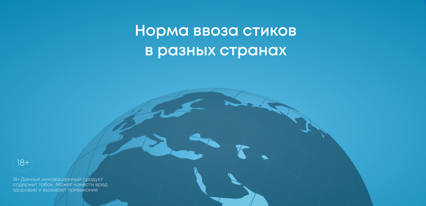Чаще всего нормы для стиков соответствуют нормам провоза обычных сигарет — в таможенных правилах нет разделения этих табачных изделий. Например, если летите в Турцию, можно провозить стандартные 200 стиков на человека, который достиг 18 лет. В ОАЭ разрешается провозить стики и прочие табачные изделия с 2019 года. По нормам можно ввозить до 400 штук как сигарет, так и стиков.